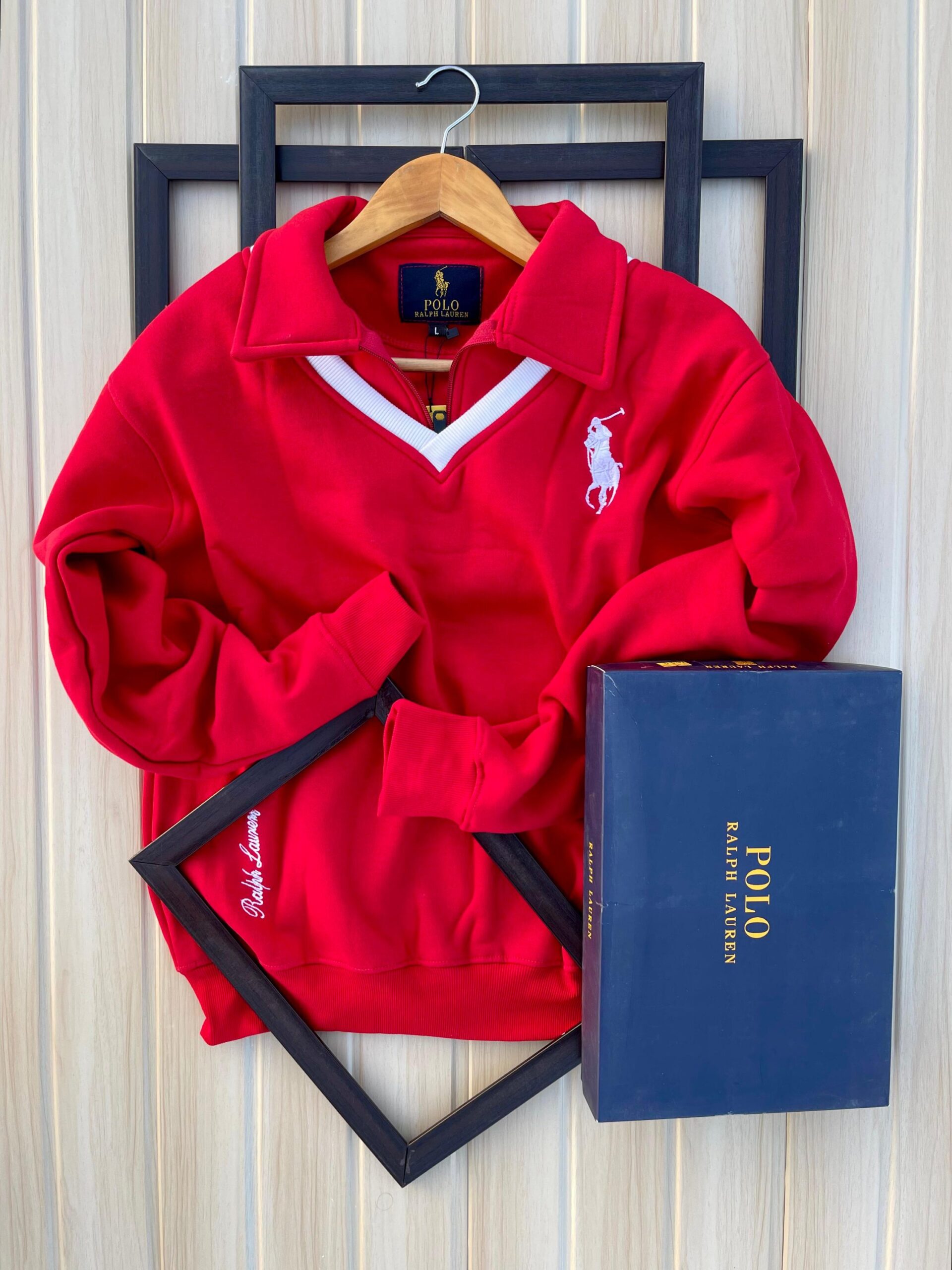 Iconic Design: Features a stylish V-neck collar neckline with contrasting trim, giving it a classic polo-style sweatshirt aesthetic. Perfect for layering or wearing on its own.